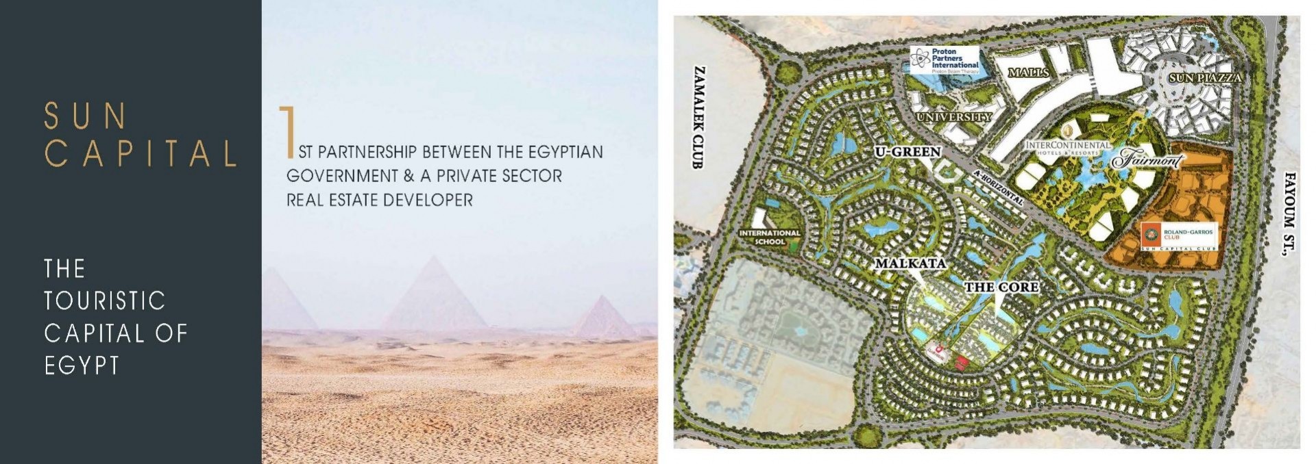 Sun Capital is one of Cairo�s most ambitious large-scale developments. The 557-acre mixed-use complex lies in the heart of the world�s most ancient civilizations nearby Cairo�s prominent destinations. The urban complex boasts 15 distinct neighborhoods including a direct view of the Great Pyramids of Giza and a 45,000 sqm landscape of open parks and water features. Every home is located within a walking distance from world-class shops, boutique diners, a business district, international schools, and a 5-Star hotel. Sun Capital is a testament of luxury that brings together ancient wonders with modern living experiences.
