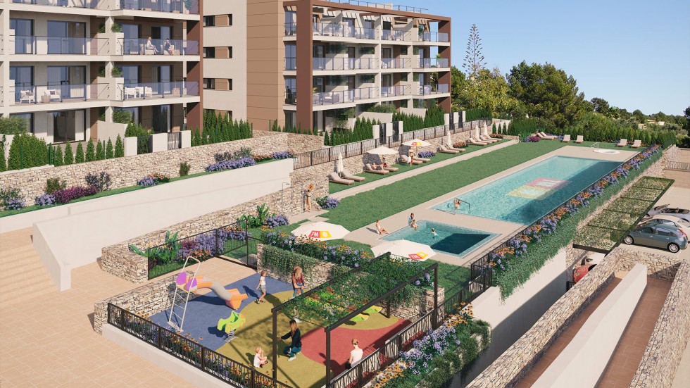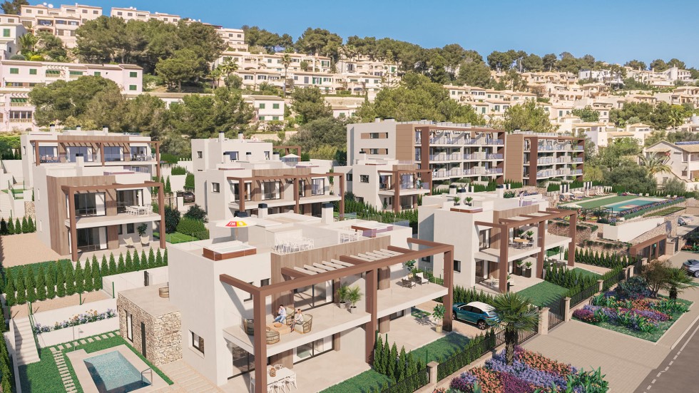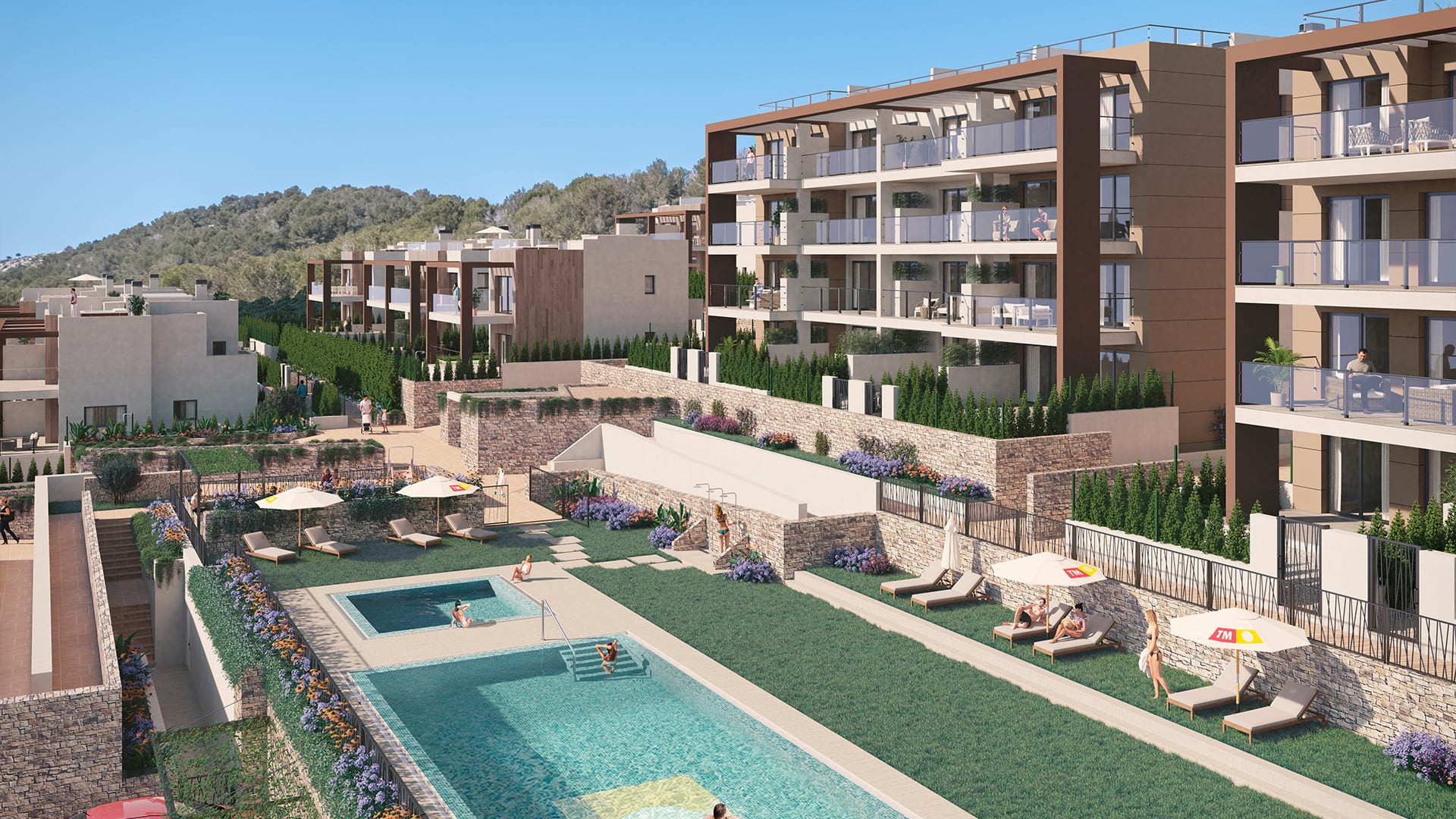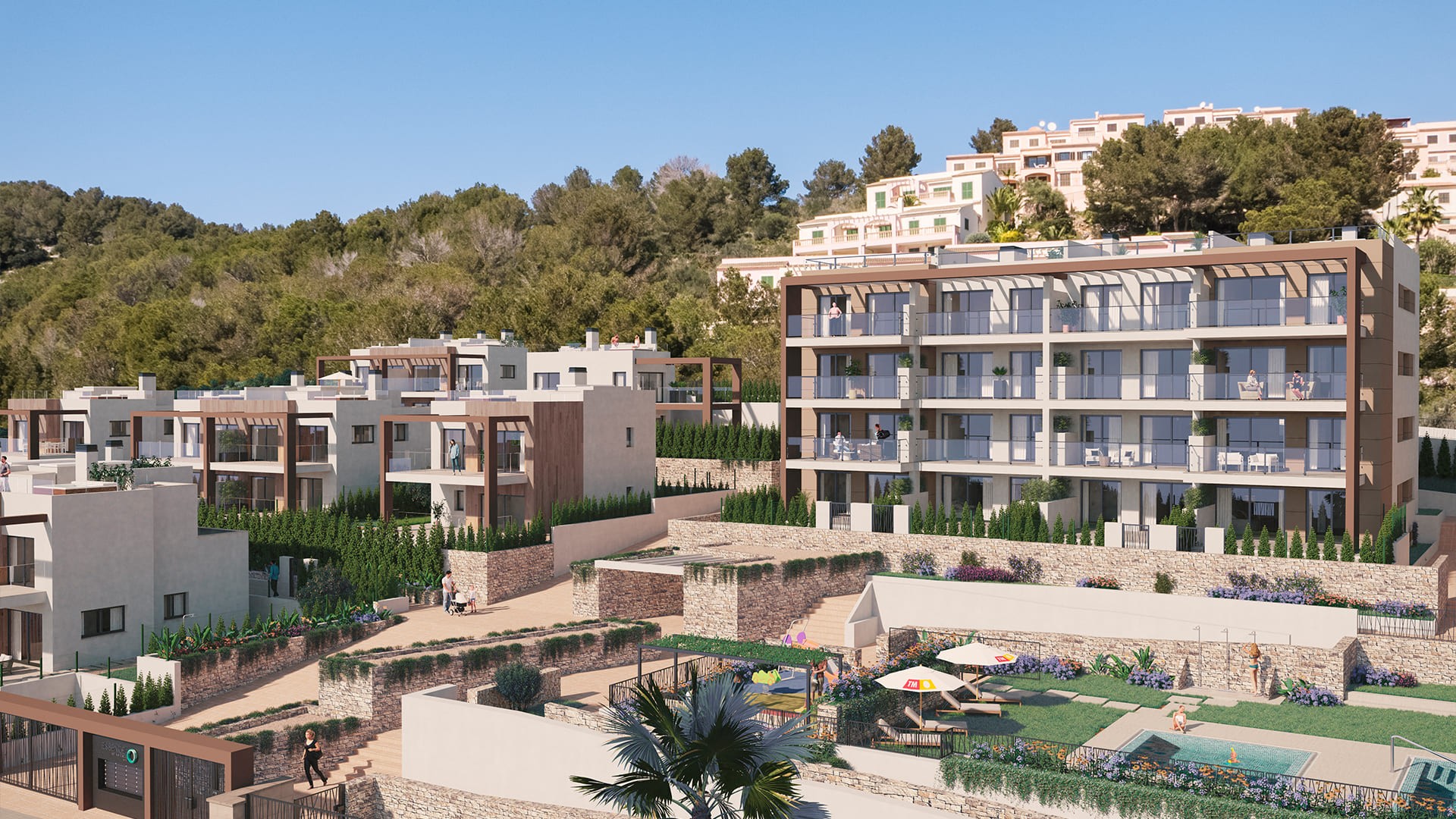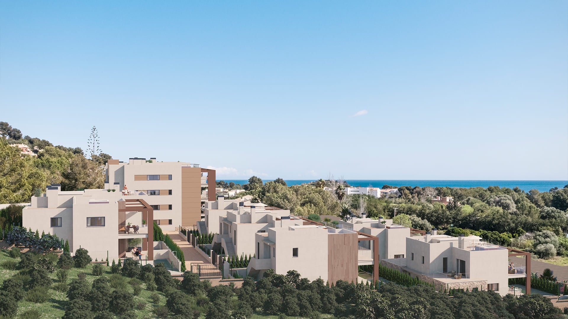 Essence of Sa Cala has 42 homes, 31 of them in 2 blocks of flats with 2 to 3 bedrooms; and 11 semi-detached and independent 2 to 3-bedroom single-family homes, with 2 and 3 bedrooms. If you are looking for an apartments, you can choose between a ground floor, first floor, or penthouse with a solarium. All apartments have a garage place and storage room, which are included in the price. If you are looking for a single-family home, you can choose between a semi-detached or detached villa. All of which are distributed between 2 floors, besides a roof top terrace, garden and a private parking space in your own plot.