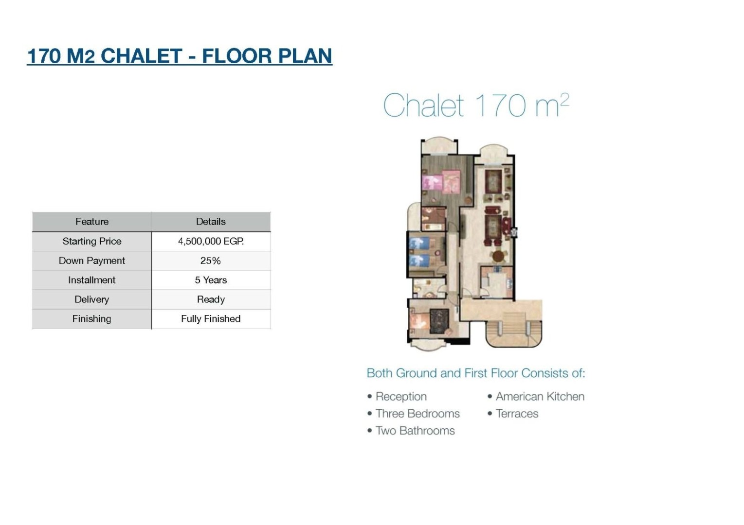 "Coral Hills North Coast Project • The Resort located in km 183 Alexandria - Matrouh Road and is built on a terrace system. All units overlook the sea and the swimming pools. All units in the entire project are only two floors (ground with garden or first with roof) The area of ??the village is 73 acres, width 400 meters, depth is 800 meters, and the length of the beach is 400 meters. • The project has 6 terraces. Each terrace is about 8 meters higher than the next one. All the buildings of the entire project are two floors, ground with garden or first with roof, and all units fully view the sea from any angle. There is no unit obstructing the vision of the next unit. • Services available in the village: • Commercial area - supermarket - pharmacy - medical clinic - restaurants - cafes - 9 swimming pools • Gym - central shower - water games - Coral Hills Hotel - Golf Car for easy transportation inside the village - House keeping from the hotel - Wi-Fi service - Marina fishing - Various playgrounds area. • The company's business history: • Dive Inn Sharm El Sheikh Hotel • Coral Hills Sharm El Sheikh Hotel • Coral Hills Resort Marsa Alam • Coral Hills North Coast • Spaces available in the resort: • Chalet 65m • 1 bedroom + 1 bathroom + reception + kitchen + 1 terrace • Chalet 124 m • 2 bedrooms + 1 bathrooms + reception + kitchen + 2 terraces • Chalet 127 m • 2 bedrooms + 2 bathrooms + reception + kitchen + 2 terraces • Chalet 170 m² • 3 bedrooms + 2 bathrooms + reception + kitchen + 3 terraces • Villa 248 meters (Twin House) • 4 bedrooms + 3 bathrooms + reception + kitchen + 3 terraces + garden + roof • Villa 341 meters (Twin House) • 5 bedrooms + 4 bathrooms + reception + kitchen + 5 terraces + garden + roof • Finishing: • All units are delivered fully finished according to the best and finest raw materials, finishing materials, marble, and porcelain available in the market. • Delivery: • The first stage: from the first terrace to the fourth terrace (immediate delivery) after contracting directly and inspecting the landscape on the site. • The second phase: the fifth terrace (delivery 12 months from the date of the contract) and the inspection also on the ground at the site. • The third stage: the sixth terrace (not opened for sale yet). • Prices: • The price starts from 2,800,000 EGP up to 14,000,000 EGP • Delivery: • The first stage: from the first terrace to the fourth terrace (25% down payment) + (10% maintenance deposit) installments over 5 years • The second stage: the fifth terrace (15% down payment) to be paid upon contracting + (10% receiving payment) to be paid after one year + (10% maintenance deposit) to be paid after one year and installments over 6 years.”