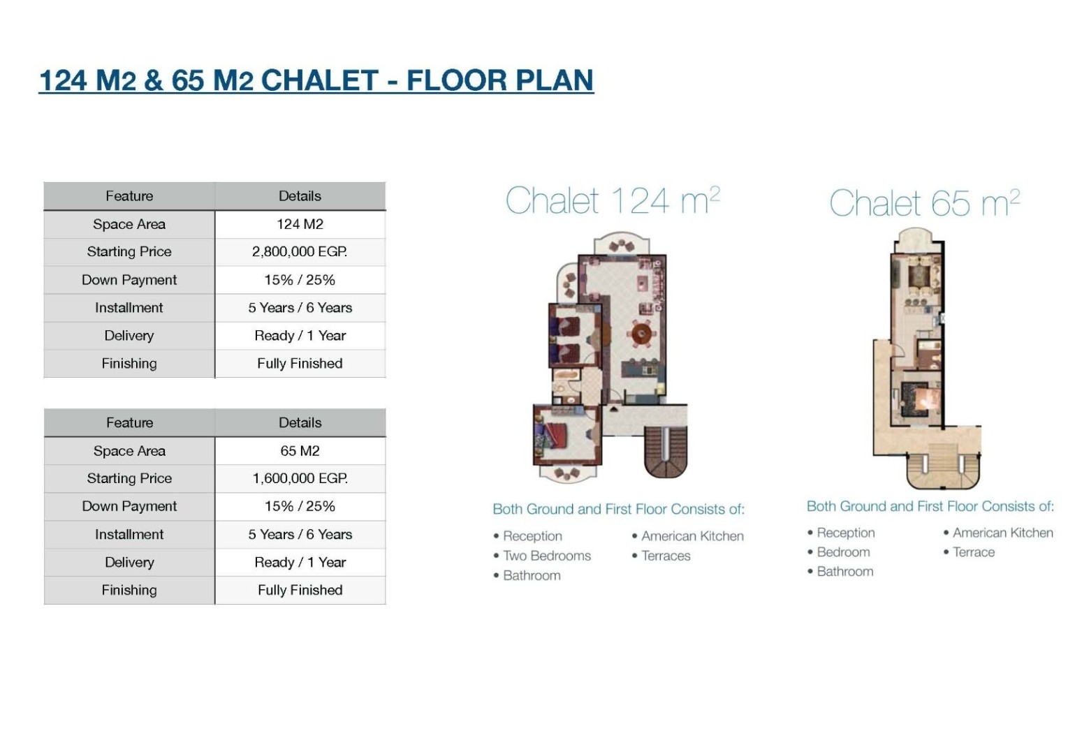 "Coral Hills North Coast Project • The Resort located in km 183 Alexandria - Matrouh Road and is built on a terrace system. All units overlook the sea and the swimming pools. All units in the entire project are only two floors (ground with garden or first with roof) The area of ??the village is 73 acres, width 400 meters, depth is 800 meters, and the length of the beach is 400 meters. • The project has 6 terraces. Each terrace is about 8 meters higher than the next one. All the buildings of the entire project are two floors, ground with garden or first with roof, and all units fully view the sea from any angle. There is no unit obstructing the vision of the next unit. • Services available in the village: • Commercial area - supermarket - pharmacy - medical clinic - restaurants - cafes - 9 swimming pools • Gym - central shower - water games - Coral Hills Hotel - Golf Car for easy transportation inside the village - House keeping from the hotel - Wi-Fi service - Marina fishing - Various playgrounds area. • The company's business history: • Dive Inn Sharm El Sheikh Hotel • Coral Hills Sharm El Sheikh Hotel • Coral Hills Resort Marsa Alam • Coral Hills North Coast • Spaces available in the resort: • Chalet 65m • 1 bedroom + 1 bathroom + reception + kitchen + 1 terrace • Chalet 124 m • 2 bedrooms + 1 bathrooms + reception + kitchen + 2 terraces • Chalet 127 m • 2 bedrooms + 2 bathrooms + reception + kitchen + 2 terraces • Chalet 170 m² • 3 bedrooms + 2 bathrooms + reception + kitchen + 3 terraces • Villa 248 meters (Twin House) • 4 bedrooms + 3 bathrooms + reception + kitchen + 3 terraces + garden + roof • Villa 341 meters (Twin House) • 5 bedrooms + 4 bathrooms + reception + kitchen + 5 terraces + garden + roof • Finishing: • All units are delivered fully finished according to the best and finest raw materials, finishing materials, marble, and porcelain available in the market. • Delivery: • The first stage: from the first terrace to the fourth terrace (immediate delivery) after contracting directly and inspecting the landscape on the site. • The second phase: the fifth terrace (delivery 12 months from the date of the contract) and the inspection also on the ground at the site. • The third stage: the sixth terrace (not opened for sale yet). • Prices: • The price starts from 2,800,000 EGP up to 14,000,000 EGP • Delivery: • The first stage: from the first terrace to the fourth terrace (25% down payment) + (10% maintenance deposit) installments over 5 years • The second stage: the fifth terrace (15% down payment) to be paid upon contracting + (10% receiving payment) to be paid after one year + (10% maintenance deposit) to be paid after one year and installments over 6 years.”