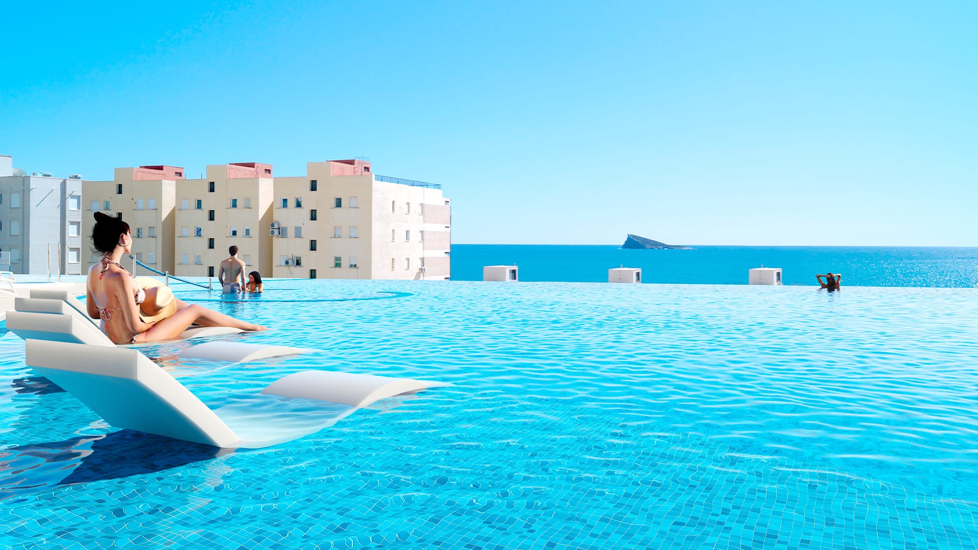 The residential complex consists of a 30-storey tower and a 40-storey tower, both facing south. The housing typologies are very varied, and you can choose between Excellence apartments with 1, 2, and 3 bedrooms with 1 or 2 bathrooms, and Premium apartments with 2, 3, and 4 bedrooms with 2 or 3 bathrooms. The design aims for maximum comfort and will allow you to enjoy the Mediterranean like never before. The (covered and uncovered) terraces will have glass railings that provide continuity to the views and allow you to enjoy them from the inside. Sunset Sailors by TM is set to become an icon of the Benidorm skyline and a reference on Poniente Beach.