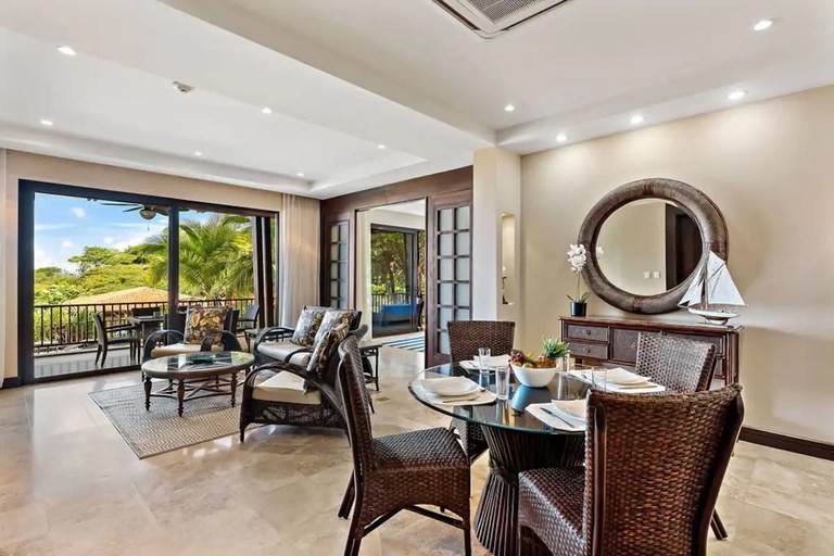 Dine inside at the 4-person dining table or out on the terrace at the six-person dining table and lounge area.