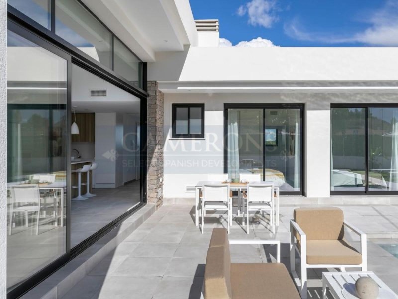 Modern detached one-level villas with private pool, 2 (Azahar) or 3 bedrooms and 2 bathrooms, utility room (Celeste model). Great access to all the services for every day, as restaurants, bars with an exquisite cuisine, educational centres, sports facilities, supermarkets, shops. 60 minutes to beach by car. 45 minutes to Corvera's airport. This is nicely built beside the nature, mountain views, closed to a very attractive tourist points such as the Sanctuary of Our Lady of Hope and Sanctuary of Vera Cruz (also Holy City), the Caves of the Port, river descent through the Segura River by kayak or boat. South-East orientation.Included in the price: - 24.5 m2 pool (7×3.5 and 6×3 mod. Azahar) and outdoor shower. - Garden area with artificial grass and the rest finished in white gravel. - Exterior and interior LED lighting and perimeter lighting. - TV points in all rooms and fiber point in the living room. - Electric blinds in bedrooms. - Intercom. - Sanitary appliances LED mirror and fixed screen. - Finished fitted wardrobes with drawers. - Fitted kitchen with Silestone countertop and front and appliances (washing machine, oven, ceramic hob, extractor hood, dishwasher and refrigerator, 150 l aerothermal heater. - The sliding windows are high security, double glazed. - Pre-installation of AC through ducts with return grilles. - Parking space and perimeter wall with fence and artificial hedge.