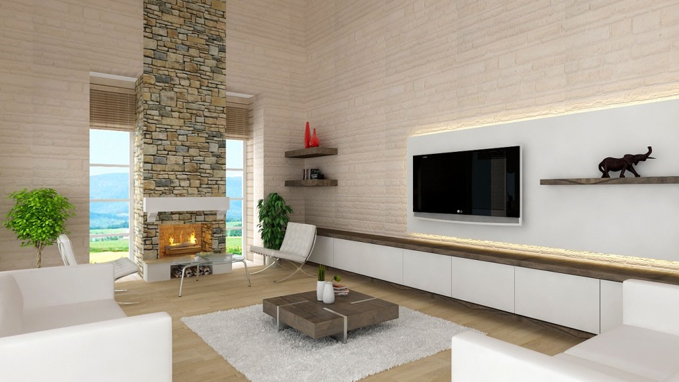 Open plan lounge with open log fireplace, dining area, and fitted kitchen
